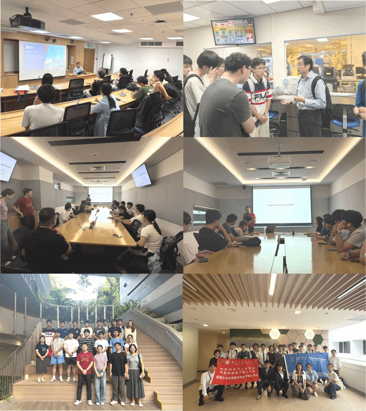 在副院长杨如森教授的精心安排与直接联络下,团队深度参访新加坡顶尖学术重镇。行程中,师生一行与来自南洋理工大学世界知名材料学家陈晓东院士、南洋理工大学副校长/美国国家发明家院士Pooi See Lee、电气与电子工程学院张青教授、物理学院范红金教授课题组,新加坡国立大学材料科学与工程系欧阳建勇教授、机械学院曾开阳教授等多个国际知名课题组举行了系列高规格学术交流活动。师生们不仅深入世界一流的材料科学实验室进行实地考察,直观了解先进纳米材料制备与表征技术,更参与了多场专题师生座谈。教授们分享了各自团队的最新研究进展、新加坡在材料科技领域的战略布局,并对学生提出的学术问题给予了深入指导,现场互动热烈,学术氛围浓厚。除了汲取顶尖学府的前沿知识,本次访学也为团队内部搭建了宝贵的交流平台。各课题组高年级博士生积极承担起指导责任,针对项目组学生在科研实践中遇到的共性挑战,如实验设计、数据处理、以及未来升学就业规划(涵盖联合培养项目申请、海外名校深造路径、材料专业职业发展等),组织了务实深入的专题分享与讨论会。 这种朋辈间的经验传承有效促进了项目组不同阶段学生的共同成长。