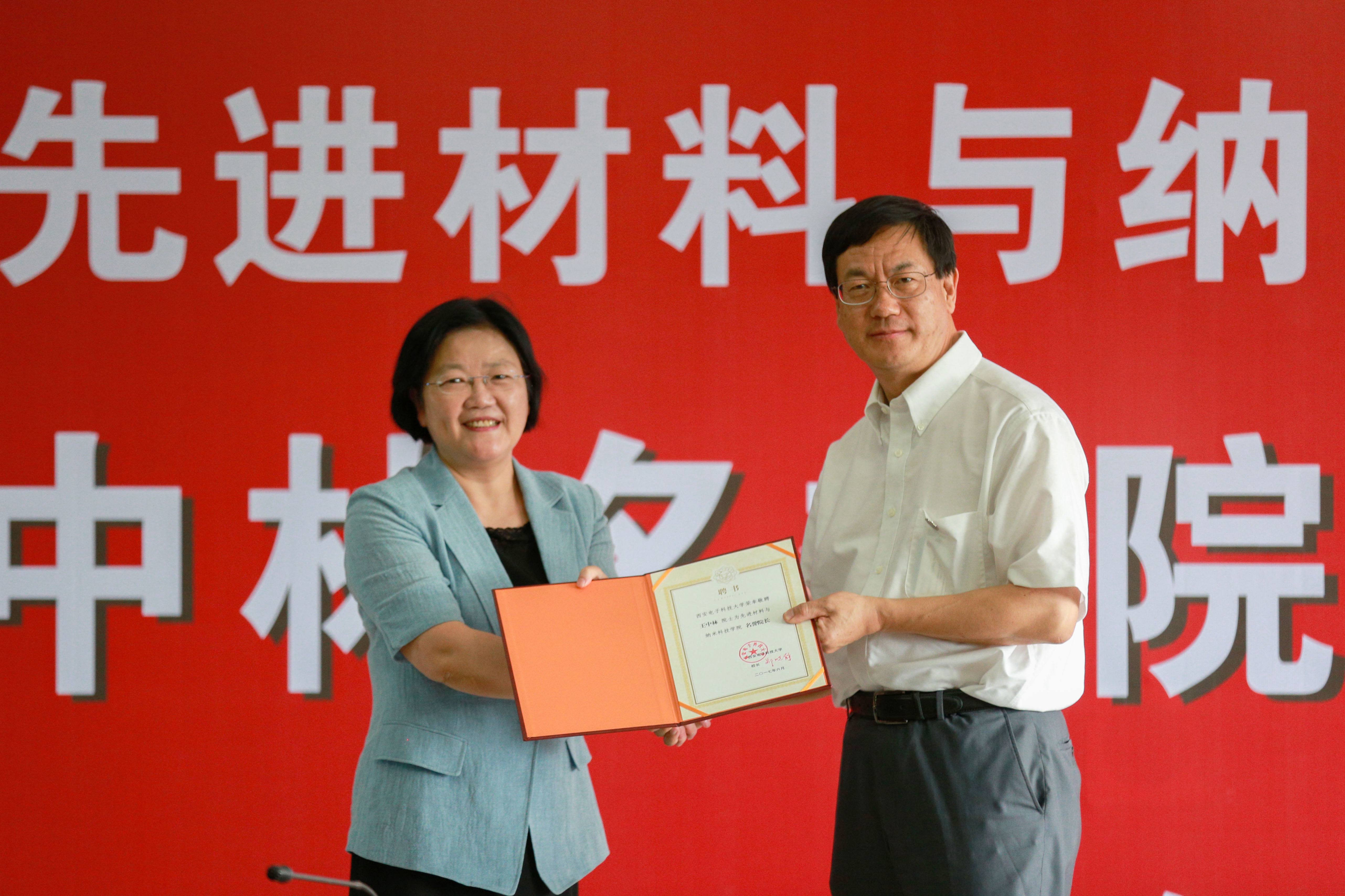 6月25日下午3时,王中林参加了“西电-北京纳米能源所合作协议”签署暨材料学院名誉院长、首席科学家、学术委员会主任授聘仪式。党委书记、校长郑晓静院士出席会议。副校长郝跃院士宣读了对王中林的聘任文件。郑晓静为王中林佩戴校徽并颁发聘书。
