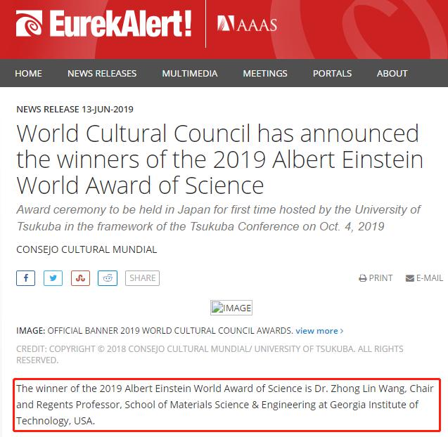 爱因斯坦世界科学奖是一项著名的世界性科学大奖,由世界文化理事会(World Cultural Council)设立,每年颁发一次,目的是表彰和鼓励世界科学技术领域的重大研究进展,授予为人类带来福祉的杰出科学家。该奖获奖人由来自50个国家和地区的124位世界著名科学家组成的跨学科委员会选出,委员会成员包括25名诺贝尔奖得主。爱因斯坦世界科学奖以伟大的科学家阿尔伯特.爱因斯坦的名字命名,象征着国际科学界的崇高荣誉。该奖项从1984年开始每年颁发1次,每次获奖人数仅为1人,之前已有35名科学家获得此奖项,其中包括4位诺贝尔奖得主,即:1995年诺贝尔化学奖得主Sherwood Rowland,1999年诺贝尔化学奖得主Ahmed Zewail,2001年诺贝尔医学奖得主Paul Nurse和2016年诺贝尔化学奖得主J. Fraser Stoddart。此外,世界文化理事会还每两年评选一次“爱因斯坦世界艺术奖”、“爱因斯坦世界教育奖”。三个奖项总计已产生了74名获奖人,尚无华人获此殊荣,王中林教授此次获奖开创了华人获得该奖的历史。颁奖典礼将于今年10月2-4日在日本举行。