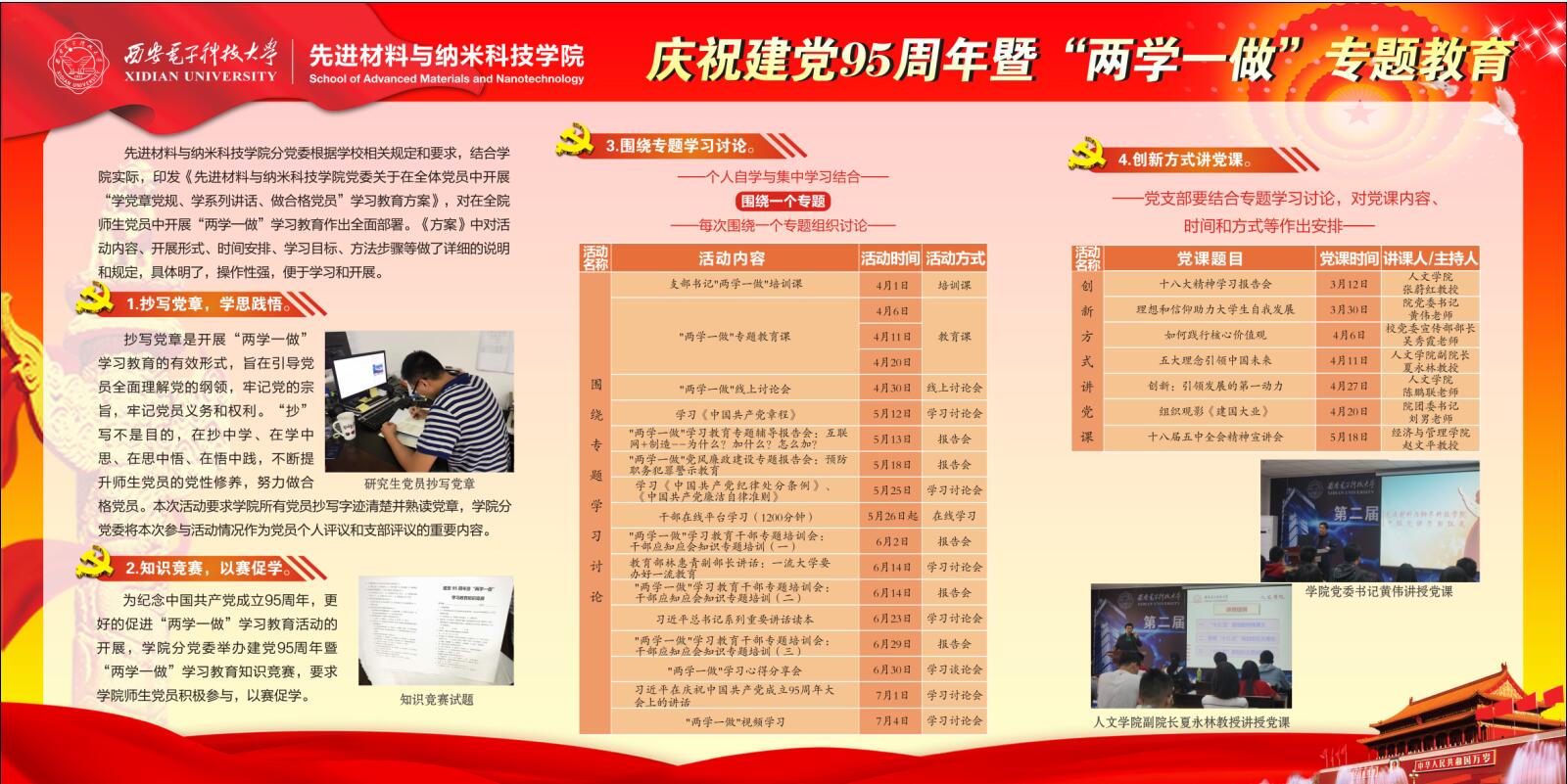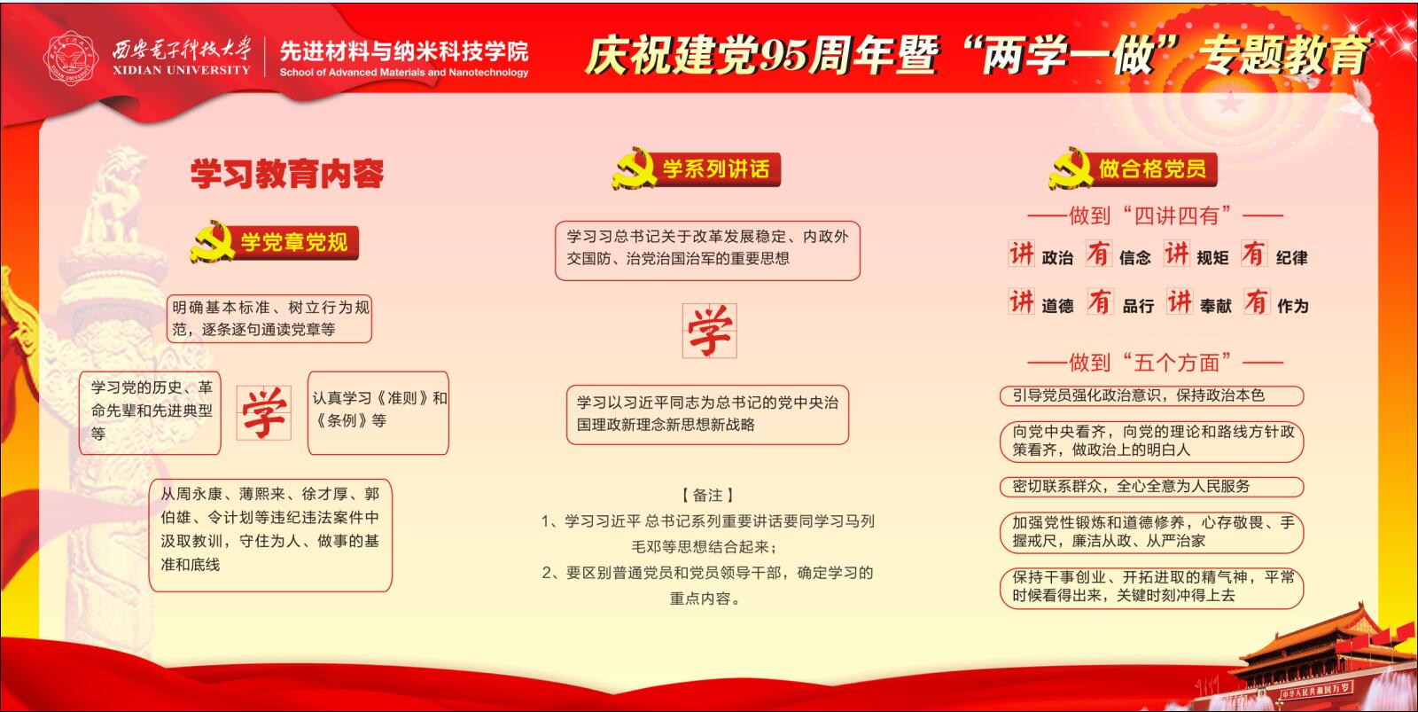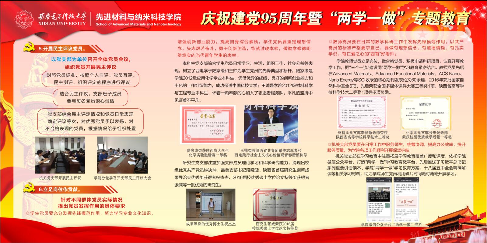 (通讯员 钟决坤 卢琳)为落实“两学一做”学习教育精神,充分发挥党员先锋模范作用,浓郁学院学习氛围,2016年9月,先进材料与纳米科技学院在G楼一层大厅学院文化展示区推出庆祝建党95周年暨“两学一做”教育专题展示。 先进材料与纳米科技学院积极开展“学党章党规、学系列讲话,做合格党员”学习教育活动,在学院分党委的指导和带领下,各支部以“两学一做”为中心开展了丰富多彩的学习教育活动,特色鲜明,成效显著。本次展示主要以展板的形式体现,紧紧围绕“两学一做”的核心教育内容、学院学习教育方案、各支部创意活动等内容,采用文字、图片和图表相结合的方式,全面、凝练且清晰的展示了“如何学、怎么做”,学院特色教育活动以及各支部将“两学一做”融入学习、教学、科研、管理等方面的风采。希望广大党员结合实际情况,立足本职岗位,积极投身学校改革发展,为“三个一流”建设做出贡献。(完)