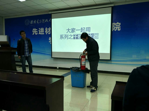 随后在班会的第二部分张哲老师给大家演示了干粉灭火器的使用方法和要领。虽然灭火器是控制和扑灭火灾最简单有效的工具,但真正熟悉灭火器用法的同学并不多,通过辅导员的演示,同学们学会了这种最基本的灭火工具的使用方法和灭火要领。