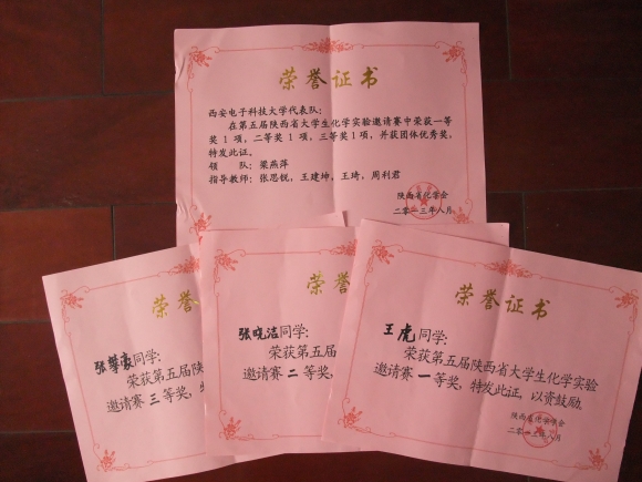 8月20日至22日,由陕西省化学会、陕西省高等学校化学实验教学中心联席会主办,西北工业大学承办的陕西省第五届大学生化学实验邀请赛近日在西北工业大学举行。先进材料与纳米科技学院应用化学系选派三位学生组队参赛,经过理论笔试和实验操作两个环节的比拼,先进材料与纳米科技学院代表队荣获个人成绩一等奖1项,二等奖1项,三等奖1项,并获得“团队优秀奖”。