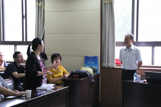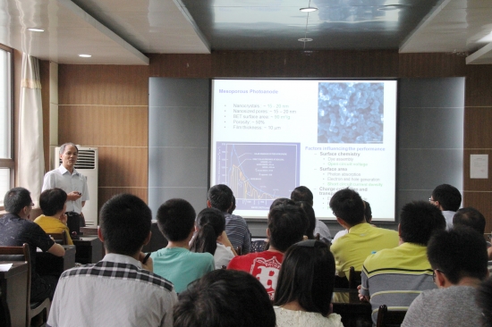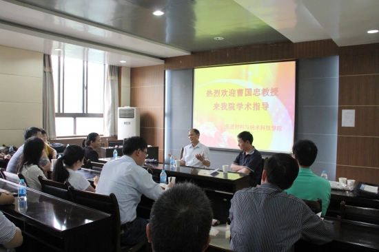 曹国忠教授介绍了其课题组在纳米材料应用于能源转换和存储领域的研究工作,重点从纳米结构光阳极在染料敏化与量子点敏化太阳能电池中的应用、纳米结构 电极在锂离子电池中的应用,以及多孔碳及其表面修饰在超级电容器中的应用等三个方面进行了介绍。先进材料与纳米科技学院50余名师生聆听了报告。报告会 后,曹国忠教授与学院教师进行了座谈交流。