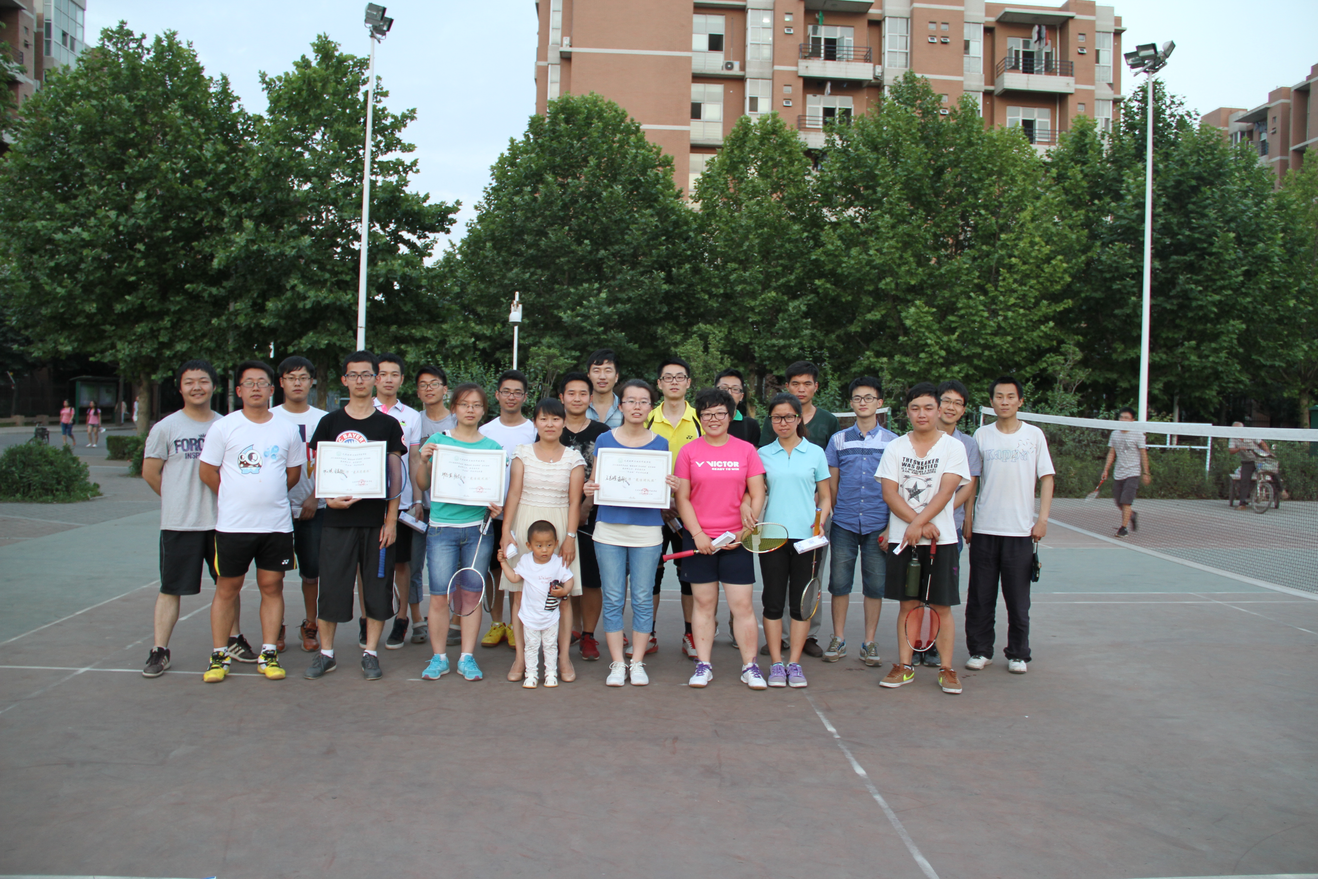 毕业季系列活动的第一站带领同学们来到了大二以后便很少集体出现的操场,6月10日晚七点,毕业生与学院老师在新校区北操场进行了一场主题为“集材料之力,展青春风采”的“师生”羽毛球友谊赛。比赛的六名同学分为两组混双,一组男双。首先是材料班邱志发和杨会搭档出场的混双组合,迎战学院办公室的两位老师组合。双方在球场上杀的难解难分,精彩的扣杀和救球不断出现,最终还是老师们的经验和技术更胜一筹,以2:0获胜。随后出场的一组混双比赛在10级化学班两位同学与老师之间展开,结果仍旧是老师组获胜。比赛的高潮出现在压轴上场的男双比赛上,学院助管高新华和教务处老师赵群强强联合,迎接材料与化学班的双强组合,两位老师一攻一守,比赛节奏张弛有度。双方精彩的表现迎来了观战同学的阵阵喝彩,比分也在同学们的掌声和叫好声中交替上升。最终两位老师凭借在多拍拉锯战中冷静的处理赢下了关键分,取得了比赛的胜利。比赛结束后,学院团委书记刘男老师为同学们颁发了奖状,并向参赛的老师和同学赠送了纪念品。