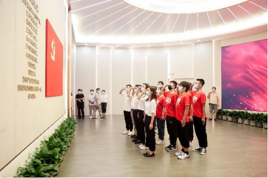 隔街而望的是同为石库门风格的中共一大会址纪念馆。纪念馆的基本陈列主题是《伟大的开端》,展陈以“初心使命”贯穿全篇,聚焦建党初期中国共产党在上海的革命实践,生动地展现了中国共产党的诞生历程。实践队队员参观了从新文化运动到五四运动,从中共一大召开到第一次工人运动高潮等建党前后的珍贵文献、图片和实物。参观结束时,全体实践队队员在党旗下重温入党誓词,时刻提醒自己铭记初心,不忘来时路。