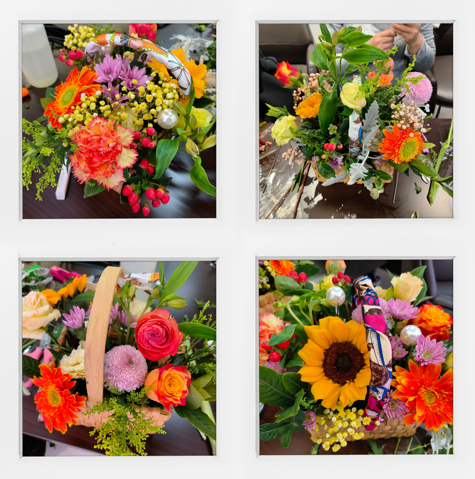 活动过程中,学院特邀独立花艺设计师思思老师进行指导,讲授了花材、修剪、配色、造型等花艺知识技巧。在老师的指导下,大家边看边学,边交流边探讨,充分发挥想象力,用自己灵巧的双手,将向日葵、康乃馨、小雏菊、满天星等多种花材有层次地搭配在一起,完成了一件件精美的作品,是对节日的祝福,也是对美好生活的向往。