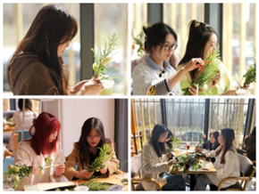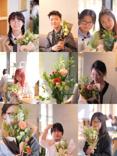 最后,经过同学们的一双双巧手,简单的花材变成了一件件精美的艺术品,一束束春意盎然、独具匠心的花束作品应运而生。活动在欢声笑语中落下帷幕,大家享受着花艺创作带来的成就感,纷纷举起作品拍照留念,留下这个美丽的瞬间。这一活动,让大家在细碎的时光研磨中品味到生活的明媚与浪漫。