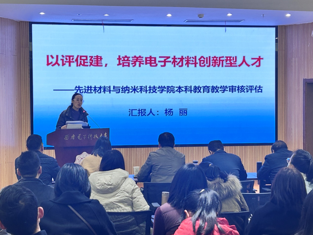 学院院长杨丽全面介绍了材料学院的发展沿革、师资队伍、人才培养、研究方向和特色核心课程教材体系等,并重点以“以评促建,培养电子材料创新型人才”为题进行汇报。她强调学院立足国家重大需求,把握西电电子信息特色,建设以物理、化学为基础,材料与电子交叉为特色的材料学科,服务于学校电子信息优势学科的发展,介绍了学院经过十年发展已建有本、硕、博、博后完整的人才培养体系,并从“人才培养规模、师资队伍、科学研究、平台条件、经费投入”等方面介绍学院本科生的人才培养成效。她表示各位教师从学院人才培养成效中要认识到学院本科人才培养存在的不足,针对学院精品课程、教材与获奖匮乏问题,学院邀请超过20所高校的国家级领军人才共同编著电子材料系列教材及专著,希望教师主动担当作为,注重课堂教学,努力提高学院本科人才培养质量;针对学院人才培养发展潜力和速度需提升问题,学院实施一对一进团队全方位培养学生创新能力,落实人才培养中的科研与平台纽带,持续性、渐进性培养学生创新能力和专业自信;针对学院创新能力培养课程体系、人才培养方案与模式不成熟,学院创办师昌绪电子材料菁英班带动教育教学研究,历时两年探索电子材料特色课程体系,所有课程实行团队负责制,保障课程质量与师资接力,培养兼具科学与工程能力的电子材料特色创新型人才。