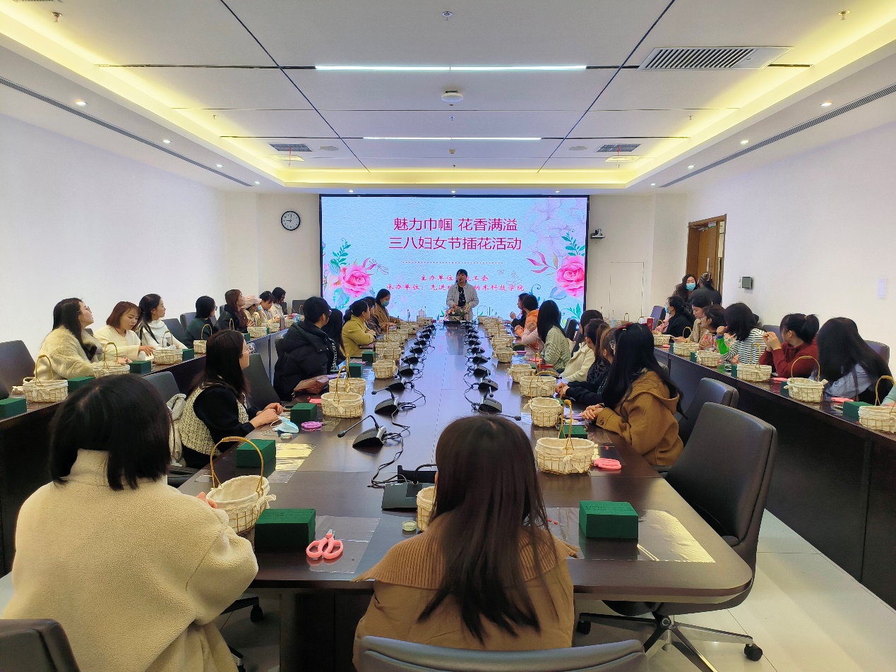 (通讯员 杜敏)人间三月,春风拂面。为庆祝第114个“三八”国际劳动妇女节,展现新时代女性风采,提升女教职工知美、爱美、会美的生活品味,舒缓压力,丰富女教职工的业余文化生活,凝聚巾帼力量,3月8日上午,先进材料与纳米科技学院和校工会联合面向全校女教职工在南校区112会议室举办“魅力巾帼 花香满溢”为主题的三八妇女节插花讲座活动。全校女教职工50余人参加本次活动,活动由学院组织员王庆毅主持。