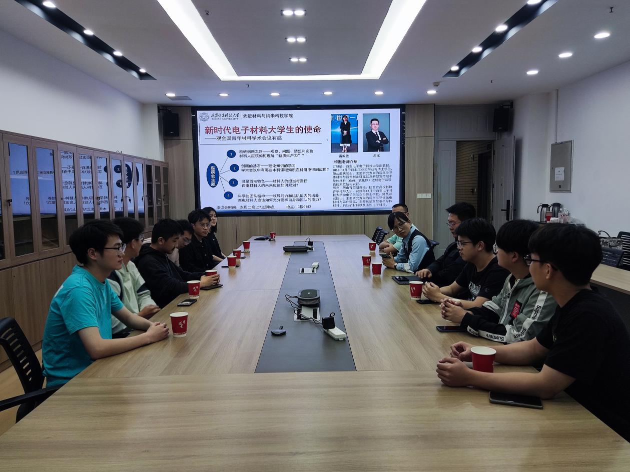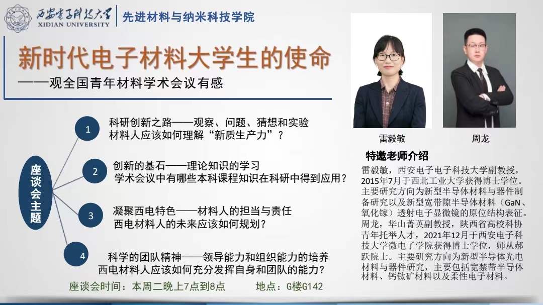 4月23日19点到20点,“新时代电子材料大学生的使命——观全国青年材料研讨会议有感”本科生座谈会在G楼G142会议室召开,材料学院雷毅敏和周龙两位老师受邀与大一至大三的本科生代表共聚一堂,深入探讨了如何在新时代背景下如何肩负起材料领域的使命与担当。