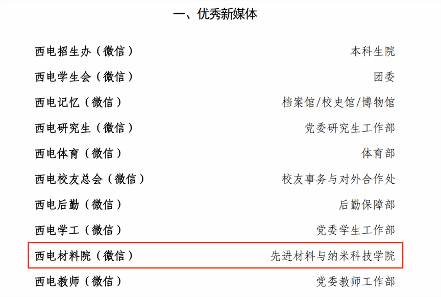 近日,西安电子科技大学第十届网络文化节评选结果揭晓,先进材料与纳米科技学院官方微信公众号“西电材料院”从学校众多新媒体平台中脱颖而出,荣获校“优秀新媒体”称号。