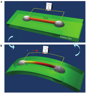 将机械能转化为电能在传感、医学、国防技术和电子信息方面有应用前景,纳米发电机从环境收集能量,可用于对微纳设备提供动力。本文报道了一种柔性电源,它基于压电细丝的循环拉伸-释放,该细丝两端牢固地附着在金属电极上,封装在柔性衬底上,并且不涉及滑动接触。单根细丝以0.05-0.1%的应变反复拉伸和释放,产生的振荡输出电压高达50 mV,细丝的能量转换效率可高达6.8%。