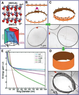 在极性纳米带的生长过程中,通过自发的自卷绕过程形成了单晶氧化锌纳米环。纳米结构是由长程静电相互作用引起的纳米带的圆形折叠形成的。纳米带逐圈缠绕形成了环。环之间的短程化学键构成了单晶结构。自卷曲是通过最小化极性电荷、表面积和弹性变形所贡献的能量来驱动。纳米带自卷曲形成的氧化锌纳米环可用于研究极性表面诱导生长过程和纳米器件。