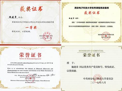 施建章老师立足讲台,躬身教学,先后承担了本科生和研究生主干课程《半导体物理》、《电介质物理》、《压电铁电物理》、《多尺度模拟与计算》、《计算机导论与程序设计基础》等多门教学任务。在多年的教学工作中,治学严谨,不断探索改革,先后主持校级教育改革计划《理工兼备,双创互融,信息特色鲜明的材料拔尖人才培养》(2022)、教材建设《ab-initio科学计算—VASP从入门到精通》(2021)、新实验改革项目《二维纳米材料的虚拟仿真实验》(2020)等项目。其中,《二维纳米材料的虚拟仿真实验》2021年被评为省级虚拟仿真一流课程,并被推荐为国家虚拟仿真一流课程。