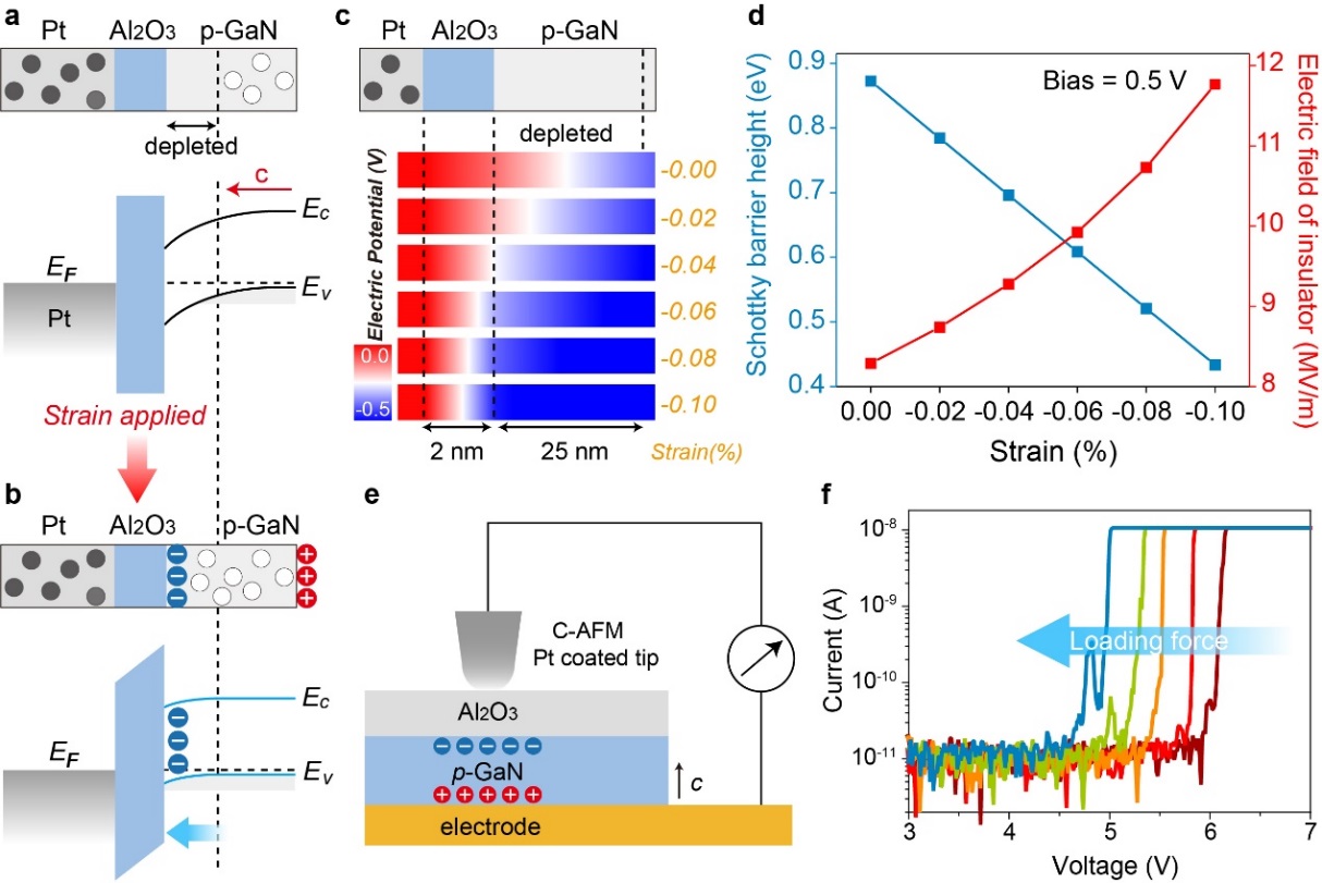 (a-d) 调控原理;e) 结构示意图;f) I-V特性曲线)