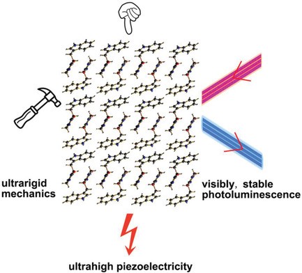 多肽材料因其生物相容性、形貌结构精确可调控性、可柔性和易于加工制备等特点,在环境能源采集领域极具应用开发潜力。但是目前这一领域还有待进一步开发和研究。文章报道了一种结构简单的甘氨酸酐-色氨酸(cyclo-GW)小分子肽材料,由于其独特的晶体结构,是鲜有的机械强度高和热稳定性良好(可耐370摄氏度高温)的生物有机材料。cyclo-GW作为一种二聚体,比单体展现出更窄得能隙结构,因此具有长时间稳定可见光致发光性能。基于cyclo-GW晶体非中心对称极性结构的特点,杨如森教授团队在科研工作中结合密度泛函理论模拟,计算发现cyclo-GW具有极高的压电系数,随后将cyclo-GW材料组装成纳米发电机,实验结果证明了该材料可适用于高效、稳定的能量采集。该纳米发电机可实现高达1.2伏的输出开路电压。杨如森教授团队所取得的科研成果为cyclo-GW材料在未来宽温能量采集和压电传感用光电集成微型器件的应用指明了方向。