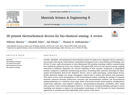 近日,西安电子科技大学先进材料与纳米科技学院Ajit Khosla教授在国际顶级期刊《Materials Science & Engineering R-reports》发表了题目为:3D printedelectrochemical devices for bio-chemical sensing: A review的论文,综述了3D打印电化学传感器的最新发展,并希望将其应用于未来生物医学领域的可穿戴和智能植入式传感器系统。