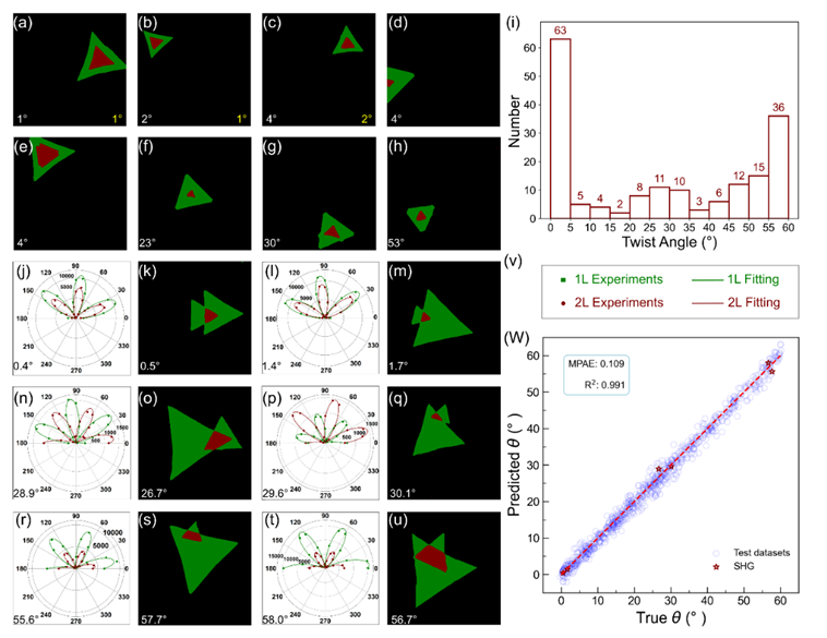 西安电子科技大学与中科院半导体所通力合作,首次实现了采用深度学习方法识别CVD生长双层二维材料的转角。首先,本工作使用光学显微镜收集了CVD制备的二硫化钼(MoS2)的颜色空间,并应用语义分割卷积神经网络(CNN)来准确快速地识别MoS2的厚度。其次,本工作训练了第二个CNN模型,以实现关于CVD生长的双层TMD材料旋转角度的精确预测,该模型创新性的使用了超过10,000个历经巧妙设计的人工合成图像的转角数据集用以训练网络,包括从六边形到三角形的几何形状。通过二次谐波和拉曼光谱的后续验证,证明设计的神经网络能够对双层TMD材料转角进行快速、精确预测。论文一经发表即得到耶鲁大学Diana Qiu教授的引用(arXiv:2404.14601),指出我们的工作使量子理论扩展到理解更大和更复杂系统的物理成为可能。