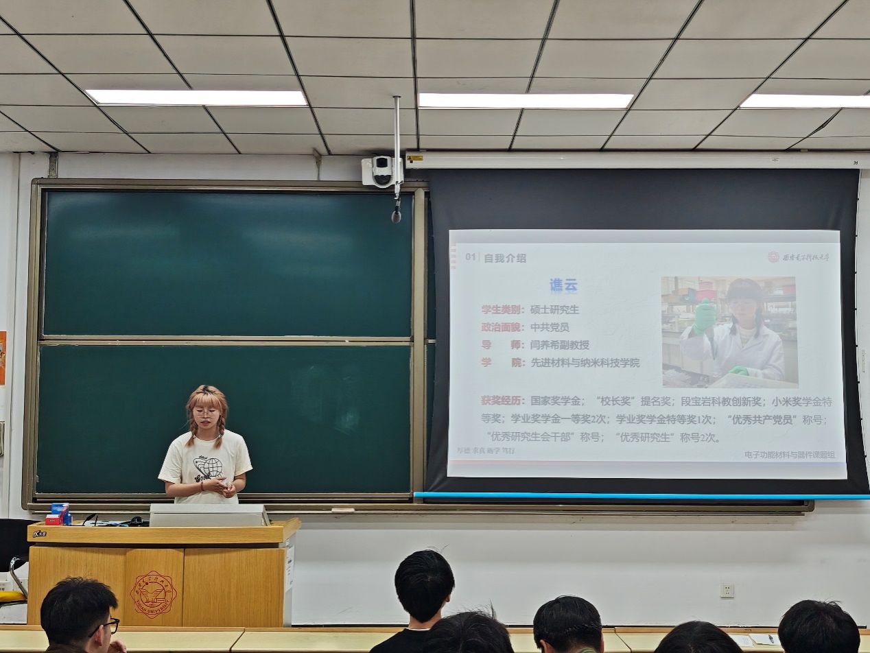 (通讯员 宫明威)5月15日晚上,为深入学习贯彻习近平新时代中国特色社会主义思想,先进材料与纳米科技学院纳米材料与技术系研究生党支部充分发挥榜样示范作用,邀请“时代之声”宣讲团成员孟哲、谯云两位同学,为参会党员及入党积极分子讲解科研进阶之路以及国防军工单位就业等主题内容。