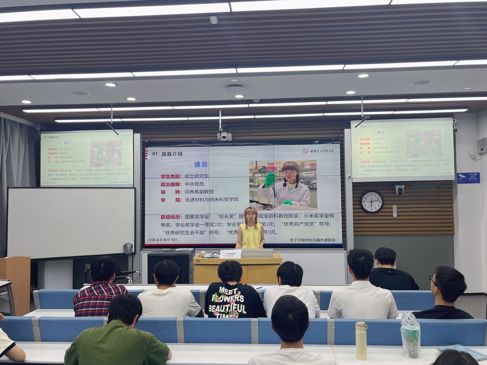 随后,先进材料与纳米科技学院的谯云同学分享了取得国家奖学金的科研之路。她结合自身的学习和科研经历,从目标设定、学习方法、科研实践、时间管理等多个方面进行了毫无保留的分享。她强调,获得国家奖学金不仅需要优异的学习成绩,更要有勇于探索的科研精神和服务社会的责任感。她的分享干货满满,让同学们深受启发,现场不时响起热烈的掌声。