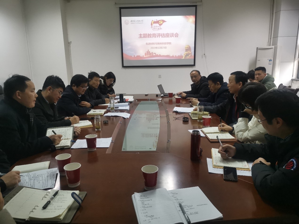 (通讯员 杜敏)根据学校党委要求和部署,结合“不忘初心、牢记使命”主题教育,2019年12月23日上午,先进材料与纳米科技学院党委在G-119会议室召开“不忘初心、牢记使命”主题教育评估座谈会,测评学院主题教育开展情况。校第一指导组成员王跃利、王海波、张维宁到会指导测评,学院领导班子成员、支部书记代表、教职工代表、学生党员代表以及群众代表共同参加了本次会议,会议由学院党委书记卢硕主持。