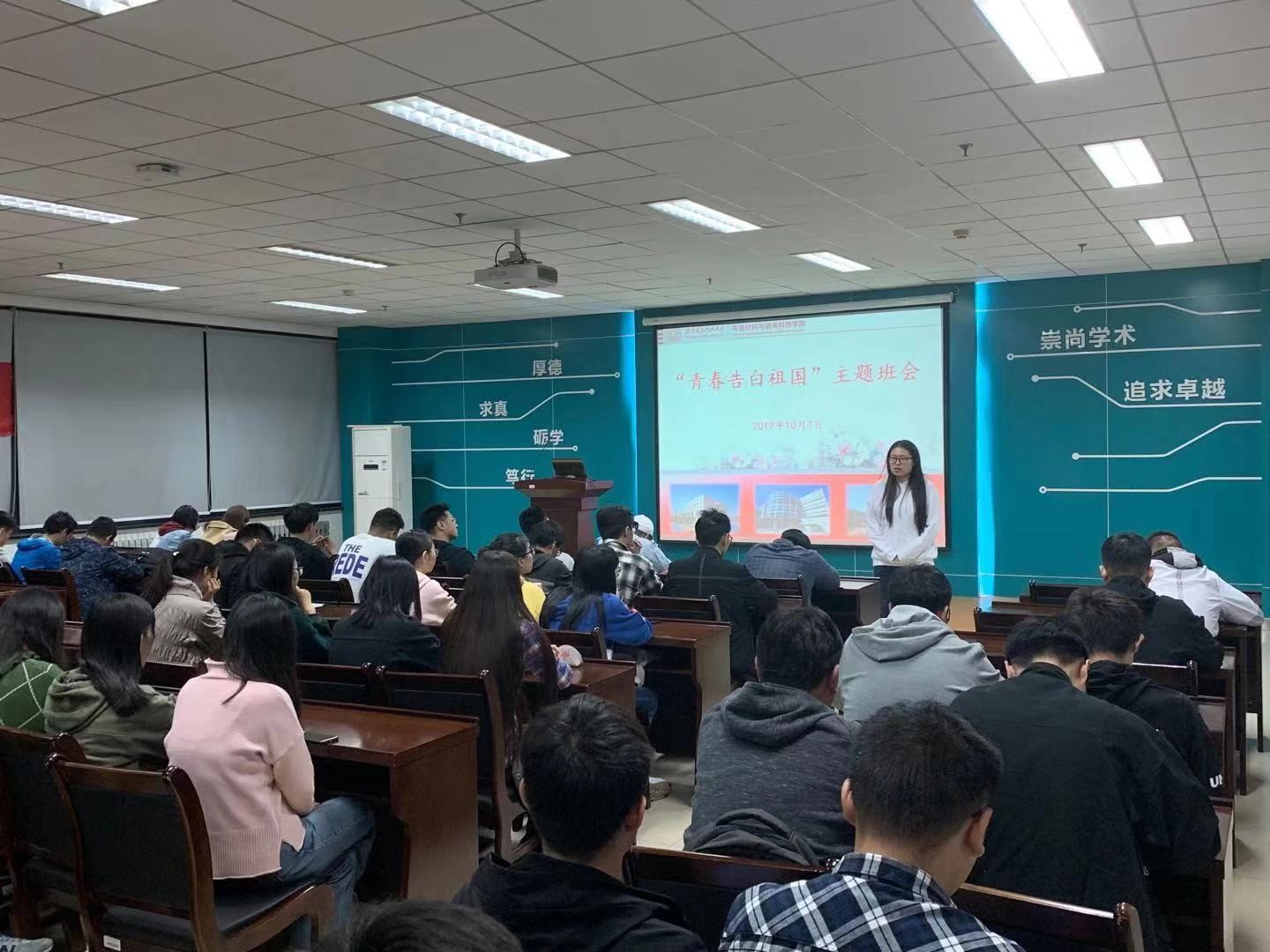 10月7日晚上,2017级本科生“青春表白祖国”主题班会在G楼118召开。班会上,辅导员李逸君结合自己所学专业为大家对比了新中国建国之初和当今“富强、民主、文明、和谐”强国的变化,让同学们由衷的为新中国70年来所发生的伟大变化而感到骄傲和自豪。接着,同学们纷纷主动结合国庆节期间自身所见所闻发表了自己的感想。学生预备党员、应用化学专业班长陈宇洋谈到,“70周年的阅兵仪式,既让我们国人感到骄傲,又向世界展示了一个比以往任何时候都更加强大的中国。当今的中国能够在维护世界和平上做出更大的贡献,也进一步提高了我们中国的国际地位”。维吾尔族学生于米提江说:“以前,我们需要不断地追赶别人,但如今,我们成了其他国家追赶的目标,当今的中国已经赢得了世界的尊重。”