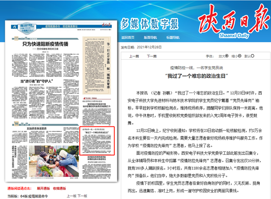 “我过了一个难忘的政治生日。”12月23日6时许,西安电子科技大学先进材料与纳米技术学院的学生党员纪宁戴着“党员先锋岗”袖标,早早赶到学校核酸检测点,维持现场秩序,提醒同学们排队保持一米距离。他说,中午休息时,手机里收到校党委组织部发来的入党2周年电子贺卡,很受鼓舞。