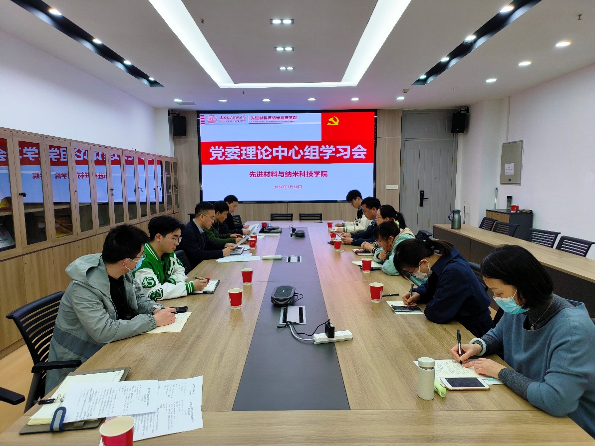 (通讯员 杜敏)3月20日下午,先进材料与纳米科技学院党委理论学习中心组在南校区G楼142会议室召开会议,专题学习全国两会精神和习近平总书记重要讲话精神等内容,学院党委理论学习中心组成员、党支部书记参加。会议由党委书记宋刚锋主持。