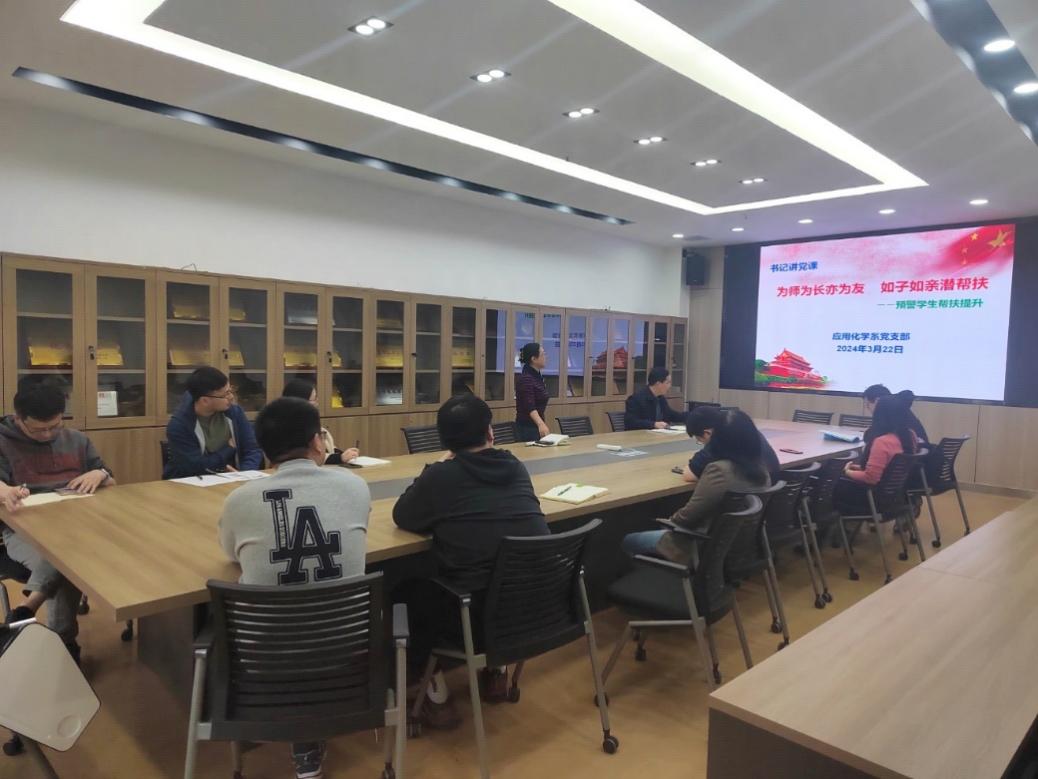 (通讯员 庞海丽 周利君)为全面贯彻党的教育方针,落实立德树人根本任务,充分发挥党员教师先锋模范作用,3月22日应用化学教师党支部开展了以“为师为长亦为友 如子如亲潜帮扶”为主题的书记讲党课活动,推进党员教师与学院各年级预警学生包联帮扶暖心活动。学院党委书记宋刚锋、副院长施建章和支部12名党员教师参加活动。