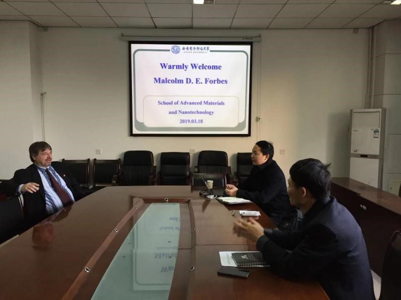 (通讯员 童晓梅 邓悦)2019年3月18日,美国博林格林州立大学 Malcolm D. E. Forbes 教授应先进材料与纳米科技学院邀请来校交流访问。上午9点,学院副院长杨如森教授、院务助理施建章副教授、学院联系教师童晓梅副教授等与 Malcolm D. E. Forbes 教授在119会议进行了交流座谈,杨如森代表学院对 Malcolm D. E. Forbes 教授的来访表示热烈欢迎,在座谈中双方就未来的合作事宜进行了热烈的沟通与交流。