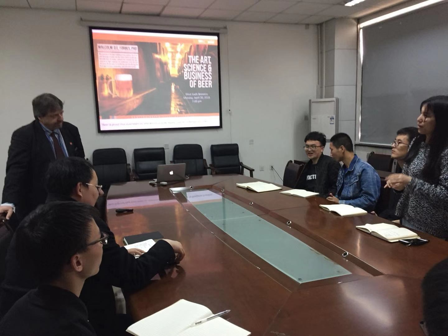 随后,Malcolm D. E. Forbes教授为我院师生作了题为“Photons, Radicals, Bubbles and Beer: Using Photochemistry and Electron Paramagnetic Resonance Spectroscopy to Understand the Universe”的报告。学院部分教师以及研究生聆听了此次报告会。报告会由杨如森主持。