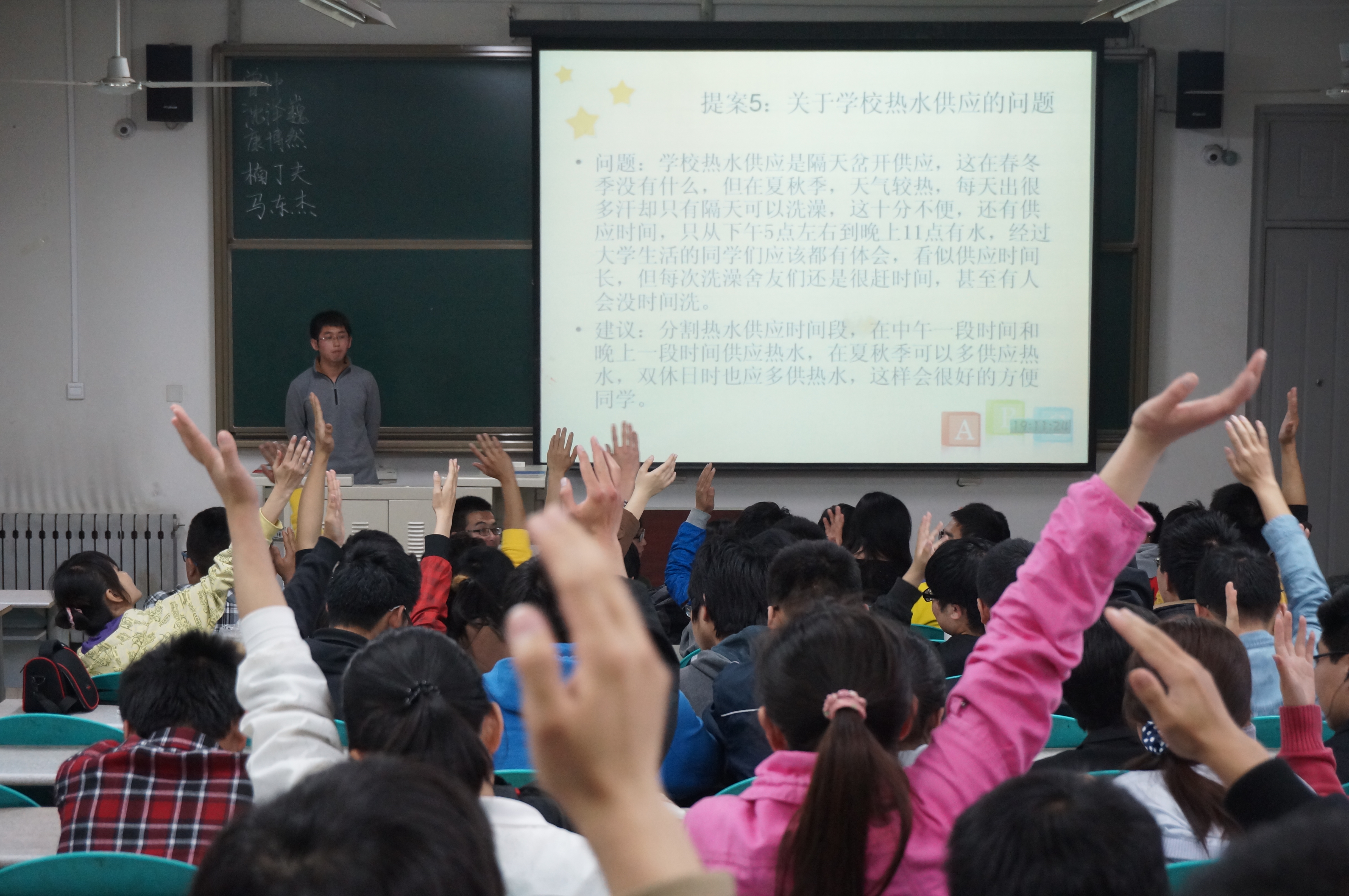 出席本次大会的领导与嘉宾有,校学生会副主席边宇凡、院学生会主席郝思远、院学生会副主席马东杰、团委副书记王帅、科协主席沈泽魏、宣传中心主席刘忠其、监选组成员李岚婷以及秦维大一辅导员刘男。出席本次大会的代表人数为86人,出席率为95.6%,缺席4人,达到代表人数4/5以上。本次大会由我院大一学生贺龙主持,本次大会的主要议程是:1.对院学生会工作进行总结与规划。2.听取并表决选举委员会的相关提案。3.选举产生第八届校学生代表。4.选举产生第八届委员会委员候选人。本次大会选举采用等额选举。学生代表候选人分别为曾帅,沈泽巍,康博然,楠丁夫,马东杰。委员候选人分别为曾帅,沈泽巍。本次选举,候选人皆以超过三分之二的票数顺利通过。本次大会的提案主要有12项:1.关于新综合楼恶臭散发问题。2.关于学生公寓中晒被子难问题。3.关于校园垃圾分类处理问题。4.关于宿舍楼前自行车停放不便问题。5.关于学校热水供应问题。6.关于提供前往校医院交通工具问题。7.关于学校安全问题。8.关于学生平时饮食问题。9.关于操场晚上供电时间问题。10.关于宿舍熄灯时间问题。11.关于在校买火车票机票问题。12.关于校园网经常断问题。选举会成员对于这些提案极为关心,在听取于表决中表现非常积极,每一项都受到众选举会成员的强烈认可。