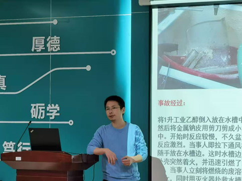 吴巍炜用“无知者无畏”“善泳者溺”作为本次讲座的开场,从一些具体的案例着手,分析了事故的原因、经过和经验教训。他又对化学试剂的安全操作、玻璃仪器的安全操作规范、化学实验室事故防范和应急处理等实验室日常操作程序做了普及,教育同学们日常做实验时应注意哪些问题,当遇到突发情况时应如何保护自己。