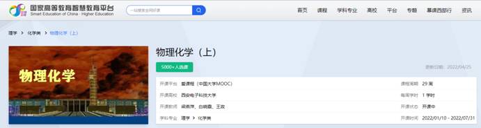 (通讯员 杜小红)3月28日,教育部举行国家智慧教育平台启动仪式并正式运行,西安电子科技大学共有70门课程首批入选。其中,我院梁燕萍教授负责主讲的《物理化学》(上、下)课程上线国家智慧高教平台,也成为我院首批在智慧高教平台上线的慕课课程。