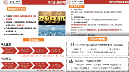 中国“互联网+”大赛作为一项顶级的大学生创新创业赛事,集科研技术与商业开发价值于一体,参赛的学生要兼顾不同评委的需求,用技术打动评委,以商品应用价值打动投资人。本次学院筹备的推进交流会,不仅有助于参赛学生了解大赛情况、理清参赛思路,同时也激发学生创新创业热情,以赛促学,激励学生扎根中国大地了解国情民情,锤炼意志品质,开拓国际视野,在创新创业的实践中增长智慧才干。