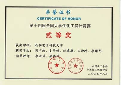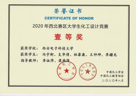 (通讯员:冯宇舸)近日,由中国化工学会、中国化工教育协会主办、合肥工业大学承办的2020“东华科技杯”第十四届全国大学生化工设计竞赛落下帷幕,来自全国293所高校的1154支队伍参加比赛。经过各个赛区激烈的角逐,西安电子科技大学先进材料与纳米科技学院应用化学专业冯宇舸、支华倩、林睿康、王帅坤、李疆龙等5名同学组成的“九折水瓶”团队,在李淑萍、梁燕萍等老师的指导下,斩获西北赛区一等奖,晋级全国决赛,最终荣获全国二等奖。