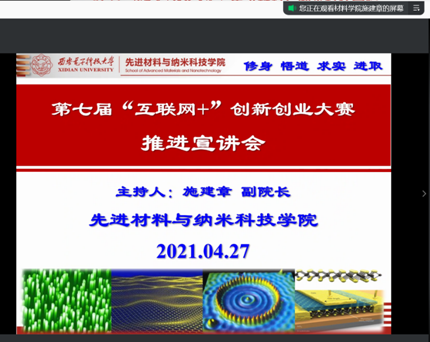 (通讯员:段晓璇)中国国际“互联网+”大学生创新创业大赛是我国深化创新创业教育改革的重要载体和关键平台,已成长为覆盖全国所有高校、面向全体大学生、影响最大的高校双创盛会。4月25日学校召开第七届中国国际“互联网+”创新创业大赛推进会,积极响应国家号召,深入推进大众创业、万众创新,加快培养创新创业人才,助力高等教育高质量发展。先进材料与纳米科技学院积极行动,广泛动员,于4月27日组织召开材料学院2021年第七届“互联网+”大赛动员会,解读大赛最新动向,传达学校最新要求,介绍学院相关扶持政策和举措,对本年度大赛进行全面动员部署,并和拟参赛同学深入交流,为他们排忧解难。本次动员大会由施建章副院长主持,学院有意向参赛的大二、大三及研究生团队代表共二十余人参会。