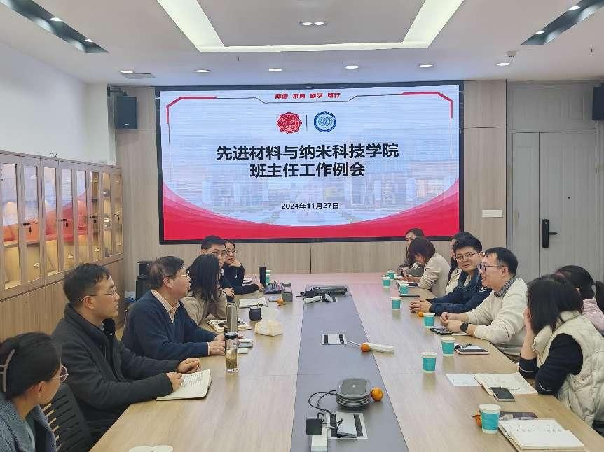 为落实立德树人根本任务,全面提升人才自主培养质量,11月27日下午,先进材料与纳米科技学院在南校区G楼会议室举行班主任工作例会,会议紧扣“提升自身能力与提高人才质量双驱动”主题,探讨并优化学生教育管理与服务工作。学院党委书记宋刚锋、执行院长杨丽、党委副书记陈刚、全体班主任和辅导员参会。